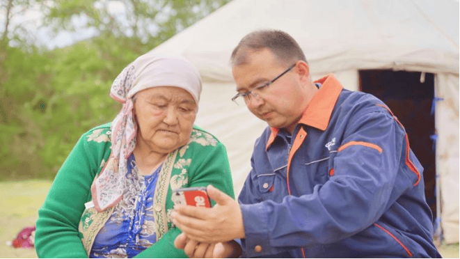 圖為新疆電信工作人員耐心向牧民講解5G應(yīng)用的功能與使用方法。