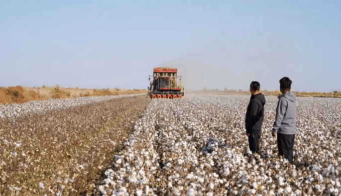 圖為新疆棉田采收季,5G賦能的自動(dòng)化采棉機(jī)在雪白棉海中穿梭作業(yè)。