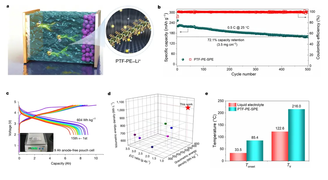 研究成果以“調(diào)控聚合物電解質(zhì)溶劑化結(jié)構(gòu)實(shí)現(xiàn) 600 Wh kg−1鋰電池”(Tailoring polymer electrolyte solvation for 600 Wh kg−1 lithium batteries)為題,于 9 月 24 日在線發(fā)表于《自然》(Nature)期刊。