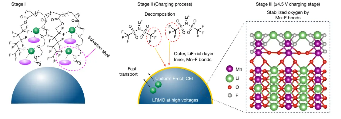 研究團(tuán)隊(duì)在聚醚電解質(zhì)中引入強(qiáng)吸電子含氟基團(tuán),顯著提升了其耐高壓性能,使其可匹配 4.7 V 高電壓富鋰錳基正極,實(shí)現(xiàn)了單一電解質(zhì)對高電壓正極與金屬鋰負(fù)極的同步兼容。基于鋰鍵化學(xué)原理,團(tuán)隊(duì)構(gòu)建了獨(dú)特的“–F???Li????O–”配位結(jié)構(gòu),誘導(dǎo)形成具有高離子電導(dǎo)率的富陰離子溶劑化結(jié)構(gòu),進(jìn)而在電極表面衍生出富含氟化物的穩(wěn)定界面層,顯著提升了界面穩(wěn)定性。