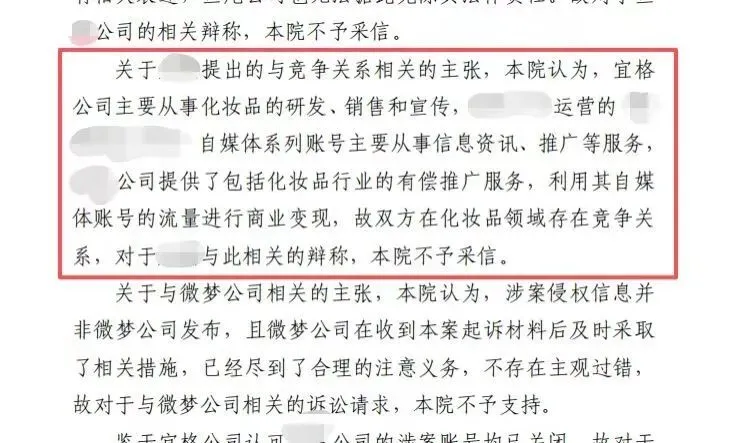 海淀區人民法院認為,羊雨控制的公司提供了包含化妝品行業的有償推廣服務,利用自媒體賬號流量進行商業變現,雙方在化妝品領域存在競爭關系。