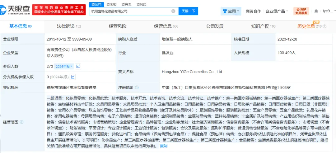 天眼查顯示,被告人羊雨控制的公司主要從事商務服務業,且已于2024年11月6日注銷;而宜格公司主要從事化妝品零售與批發等業務。