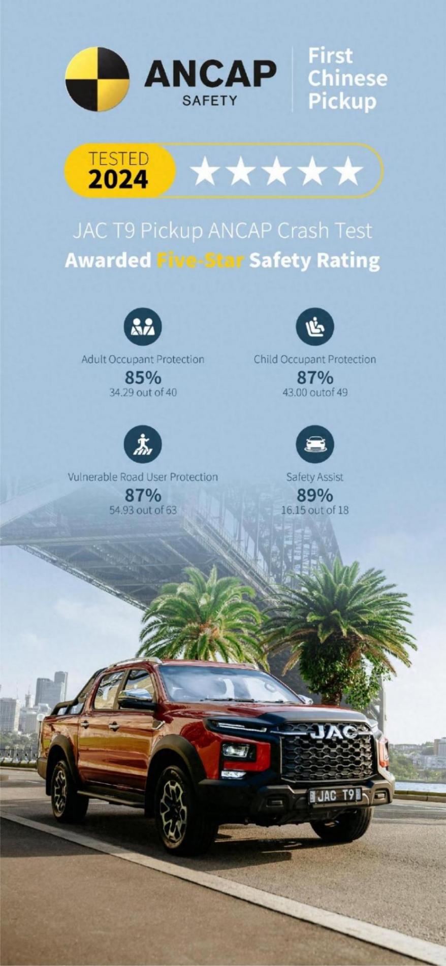 安全無小事,江淮皮卡始終將安全放在產品研發和制造的首要位置。江淮T9(即全新悍途)在澳洲ANCAP碰撞測試中亮出“底牌”,不僅榮獲最高五星安全評級,而且還是澳洲ANCAP新規下中國品牌皮卡第一個五星、全球皮卡綜合得分第一,樹立行業天花板級安全水準。