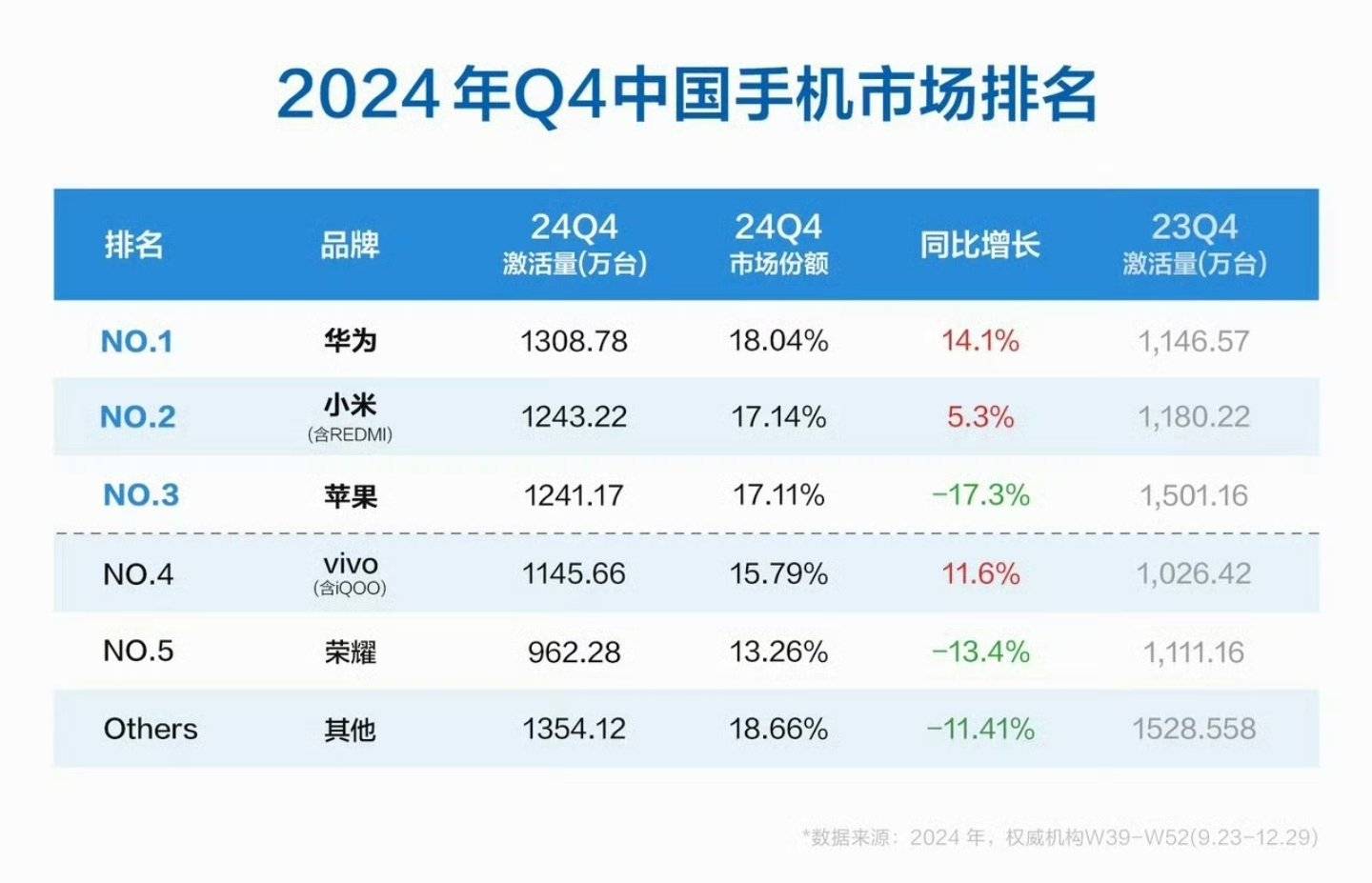 排名第二的是小米,它的激活量為1243.22萬臺,市場份額為17.14%,同比增長5.3%。和去年相比,小米和第一名的差距大幅縮小,從320.95萬臺縮小至65.56萬臺。作為橫向?qū)Ρ龋?022年Q4小米激活量僅為853.06萬臺,2023年Q4小米激活量為1180.21萬臺。和華為有所不同,小米激活量主力軍是小米15系列和紅米K80系列,所以在高端市場小米還需要繼續(xù)努力。