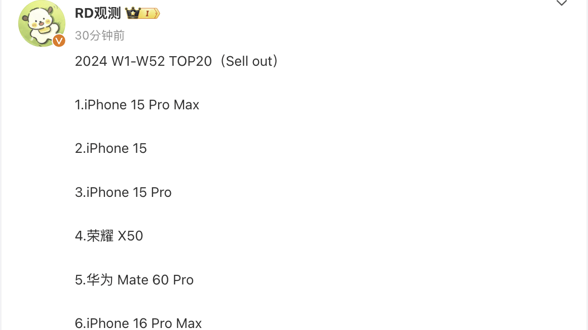 排名第一的是華為,它的激活量為1308.78萬臺,市場份額達到了18.04%,同比增長達到了14.1%,是榜單中增速最快的手機廠商。作為橫向?qū)Ρ龋?023年Q4激活量僅為1146.57萬臺,在榜單中僅次于蘋果和小米排名第三。根據(jù)暢銷榜數(shù)據(jù)顯示,華為Mate70系列并不是主力機,還有華為Mate60系列、Nova12系列和Pura70系系列,個人一種旗艦機型都是主力的感覺。