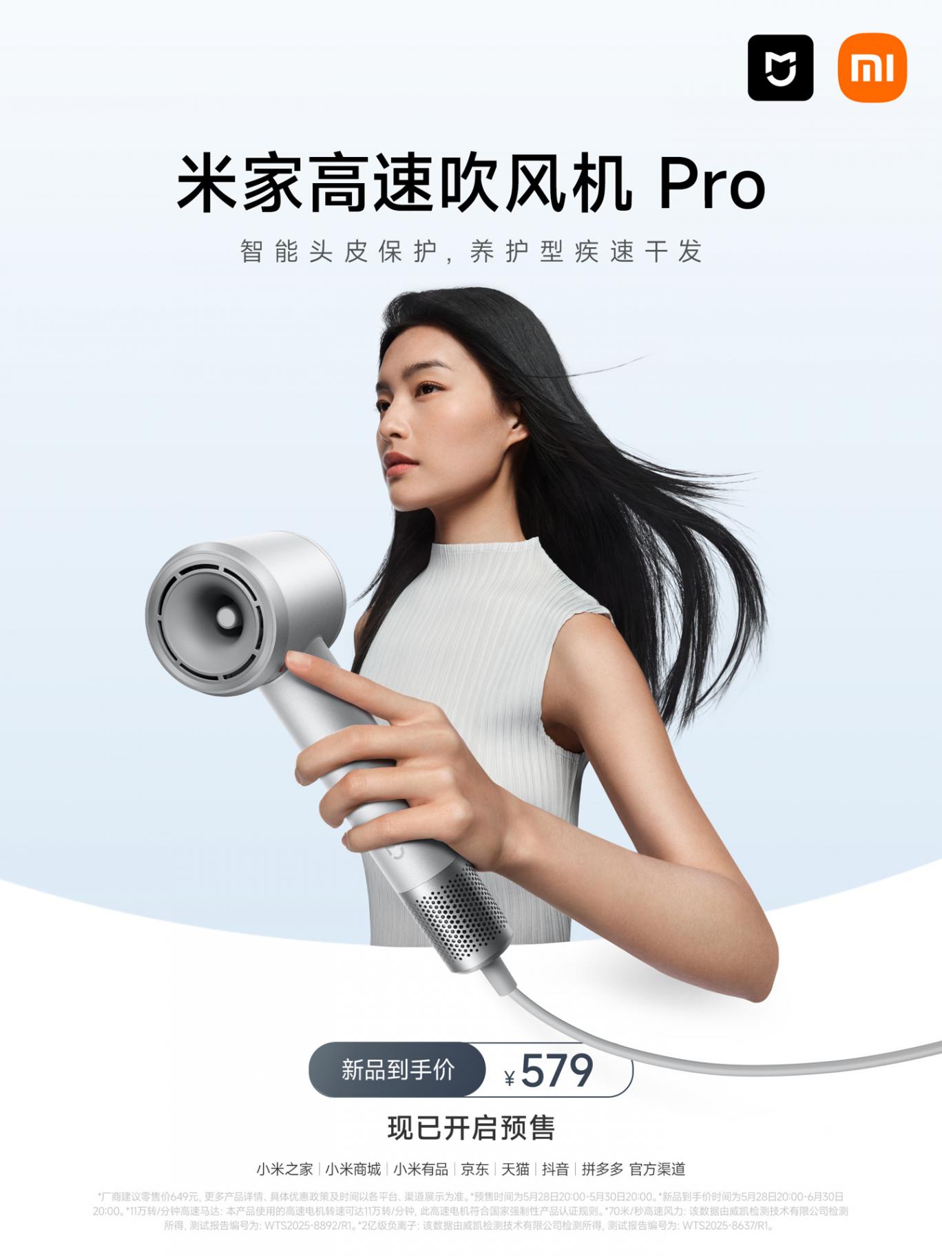 5 月 28 日消息,小米智能生態官微今晚宣布,米家高速吹風機 Pro 現已開啟預售,其內置全新頭皮保護模式,50°C 恒溫護頭皮;搭載了 11 萬轉 / 分鐘高速馬達,到手價 579 元。