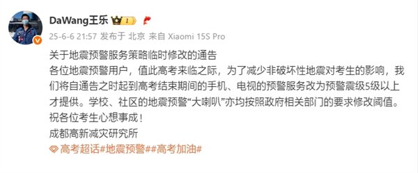 6月7日消息,據(jù)小米公司應(yīng)用軟件部總監(jiān) 王樂介紹,小米地震預(yù)警服務(wù)策略臨時(shí)修改。