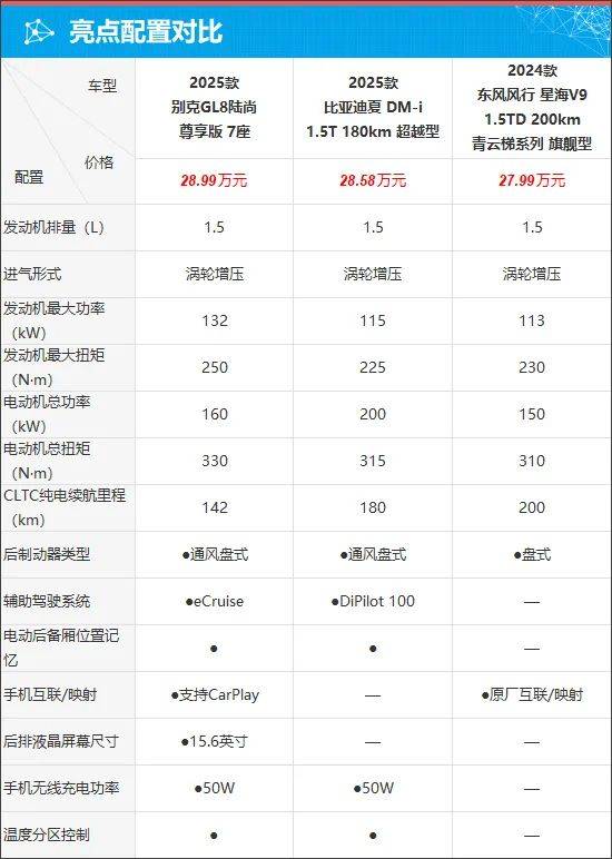 車型數量方面,別克GL8陸尚目前僅提供3款配置可供,雖然數量不多,但是高、中、低的組合搭配確實簡單明了。比亞迪夏共有5款車型可供選擇,除了配置不同,CLTC純電續航里程也分為100km和180km兩個版本。東風風行星海V9在售車型多達7款,其中還包括全新上市的2025款車型,選擇十分豐富。