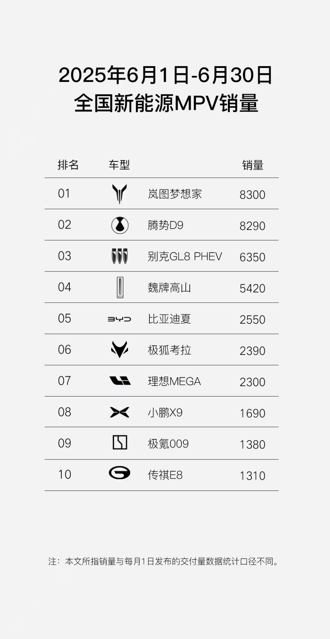 就拿剛剛過去的6月份來說,嵐圖夢想家以8300臺的月銷成績,成為了新能源MPV銷量冠軍,不管是國產高端MPV,還是老牌合資MPV,全部都被嵐圖夢想家斬于馬下。