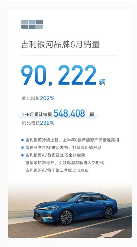 7月1日,吉利汽車控股有限公司發布的數據顯示,今年6月,其乘用車銷量達23.6萬輛,同比增長42%。其中,新能源車(含吉利、領克、極氪)銷量達12.24萬輛,同比增長86%。