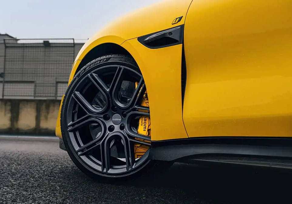 車身側面線條依舊是標準的轎車樣式,前翼子板帶有輪拱通風開口,上面鑲嵌著 “U” 標識 LOGO 以及雷達探頭等硬件。車輛的外后視鏡殼采用碳纖維材質,輪圈為雙五輻式的 21 英寸規格,并且標配碳陶制動系統。作為紐北限量版,它匹配的是倍耐力 P ZERO TROFEO RS 半熱熔輪胎,前后輪胎規格分別為 265/35 R21、325/30 R21,能為車輛提供更出色的抓地力。