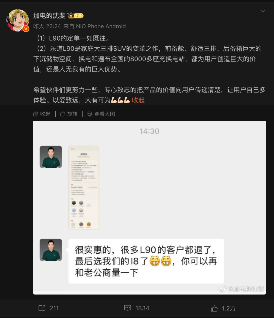 8月5日,蔚來(lái)沈斐曝光理想銷售勸退樂道L90訂單:“許多L90客戶已轉(zhuǎn)訂i8,建議您和家人商量”。
