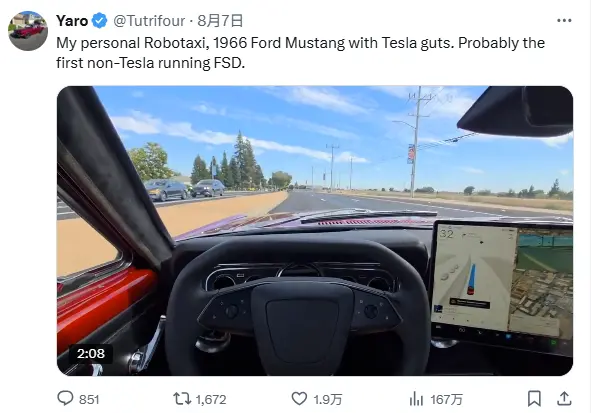 在看到這個視頻之前,可能很多人都沒見過這種“拼車”方式。將特斯拉的智駕技術和 1966 年的福特野馬結合,可不是靠“情懷”二字就能完成的事。