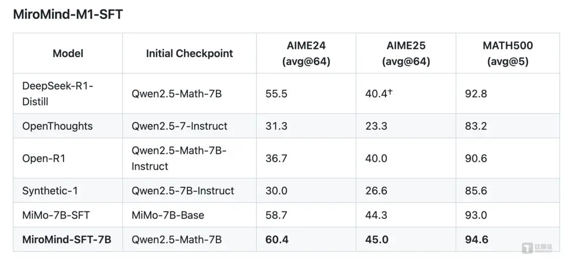 在AIME24、AIME25和MATH500上,MiroMind-M1-SFT版和MiroMind-M1-RL(強化學習)版本都取得了最佳性能,數學能力超越了DeepSeek-R1蒸餾版和小米的MiMo-7B-Base。