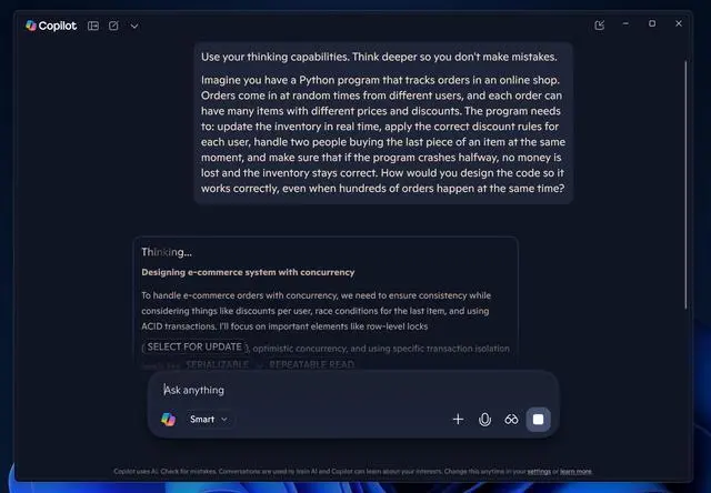 這意味著無需更新應用即可啟用“智能”或 GPT-5 模式。但它與 OpenAI 的實現有何不同?在測試中,我們發現 Microsoft Copilot 免費提供寬松的用量限制。