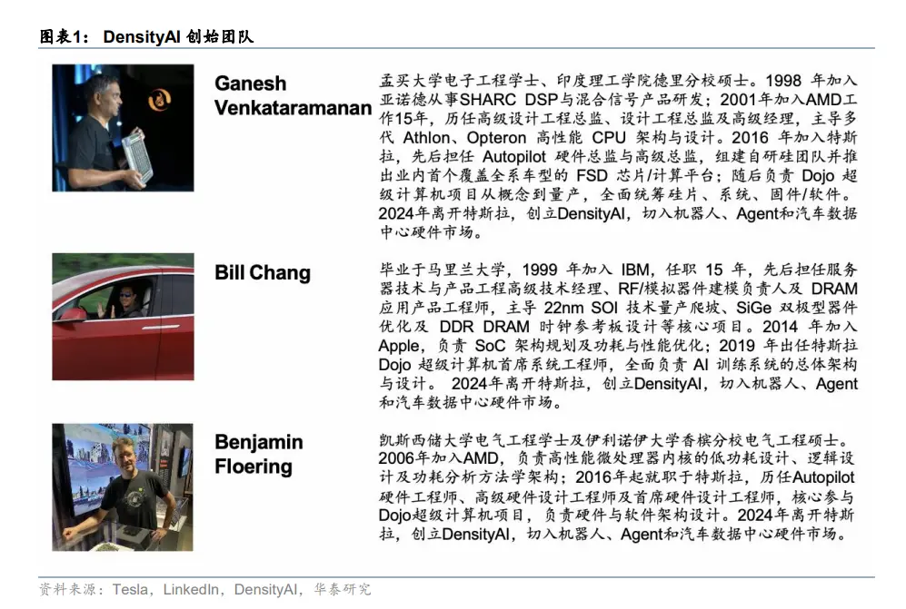 項目的首個重大沖擊來自核心團隊集體流失。據彭博社報道,2023 年 Dojo 負責人 Ganesh Venkataramanan 離開后成立了競對初創公司 DensityAI,目前約 20 名核心工程 師也離開特斯拉并加入 DensityAI。另外,現任 Dojo 負責人 Peter Bannon 據彭博報道也 將離開特斯拉。這使項目在研發與執行層面出現明顯真空。DensityAI 聚焦為機器人、AI Agent 及汽車領域的 AI 數據中心提供芯片、硬件及軟件解決方案,產品方向與 Dojo 高度重 疊,直接進入特斯拉原本擬依托 Dojo 搶占的市場賽道。公司由前特斯拉 AI 與芯片研發骨 干創立,包括 Ganesh Venkataramanan、Bill Chang、Benjamin Floerin 等 Dojo 核心負責 人及技術骨干。