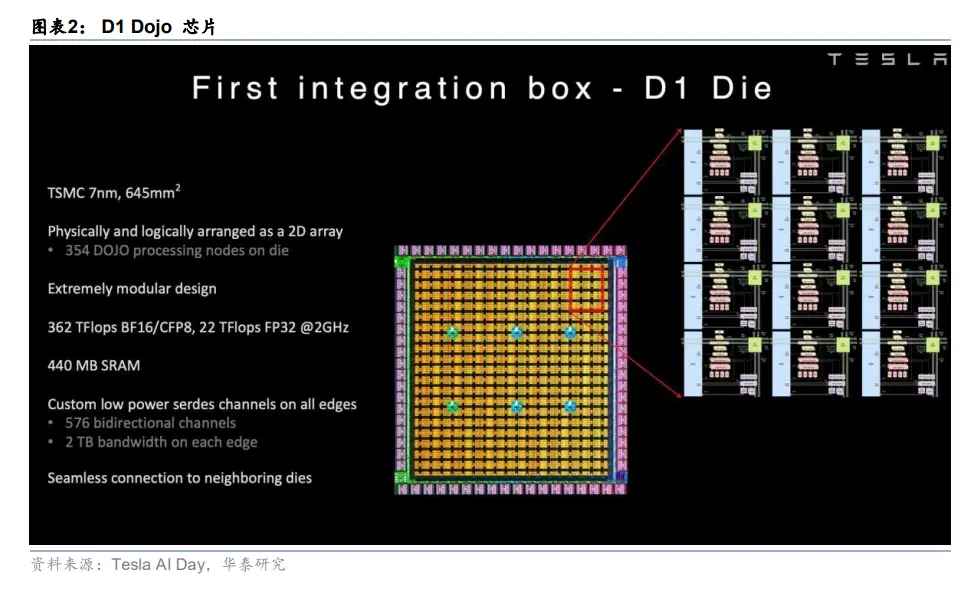 2) “無膠化(Glueless)”的晶 圓級互連。Dojo 目標的真正核心是其互連設計。特斯拉利用臺積電的 InFO_SoW(晶圓上集成扇出, Integrated Fan-Out System on Wafer)技術 創建了“Training Tile”訓練單元,其并非 PCB 板,而是建立在載體晶圓上 的單一、巨大的多芯片模組,以 5x5 陣列的方式容納 25 個 D1 芯片。這些 芯片專為“無膠化”通信而設計,通過數千個高速 SerDes 鏈路直接連接到 相鄰芯片,創造了一個統一的計算平面,可達 36TB/秒片外帶寬,消除困擾 傳統超算的網絡瓶頸。