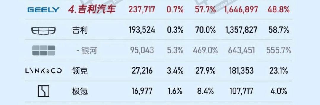 市場頭部方面,吉利則通過銀河、領克等多品牌產品攻勢,實現了高速的增長,據中汽協數據,7月份吉利汽車銷量達23.7萬輛,同比增長高達57.7%,其新能源增長主力由吉利和銀河品牌貢獻,銀河品牌7月同比增長幅度達到驚人的469%,累計銷量9.5萬輛,僅星愿一款車就貢獻了4.4萬輛的銷量,星耀8銷量破萬,實現對比亞迪漢的反超,在主流新能源市場市場號召力不斷提升。而吉利品牌銷量同比增長達70%,累計銷量19.4萬輛,傳統燃油車板塊依舊穩健,博越L、星越L穩居細分市場前列,新能源轉型持續推進。