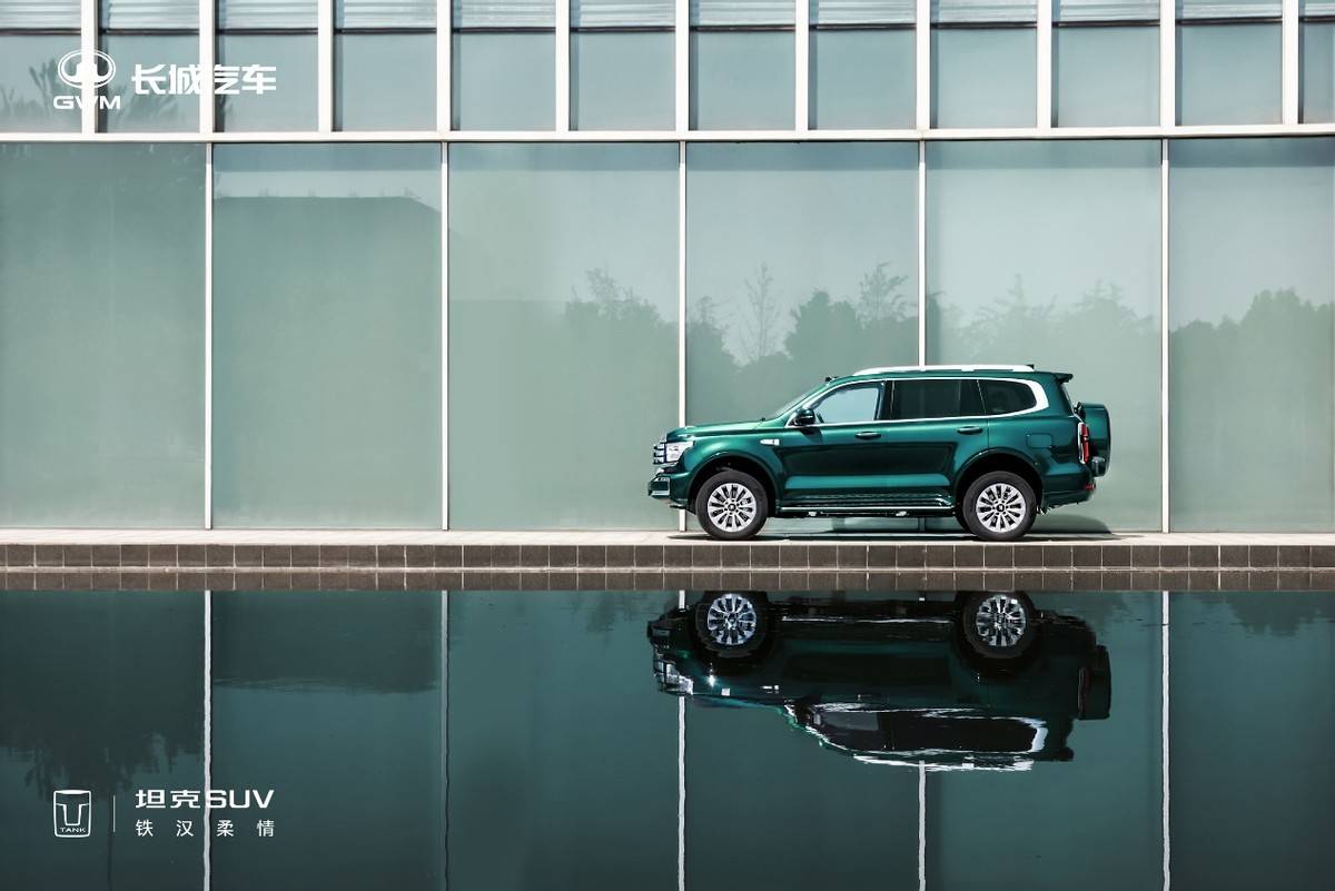 全新坦克500在外觀設計上融入了中國古典建筑元素,車身線條硬朗大氣,新增"敦煌綠"車色,進一步強化了豪華越野SUV的視覺沖擊力。