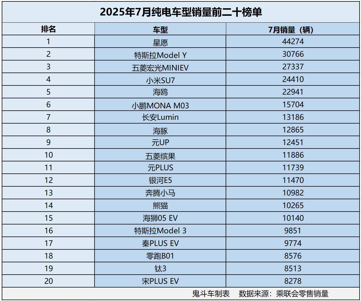 五菱宏光MINI EV排名第三位,7月零售銷(xiāo)量達(dá)到27337輛,它賣(mài)得好的一大原因是價(jià)格門(mén)檻低,性?xún)r(jià)比夠高。小米SU7排名第四位,7月零售銷(xiāo)量達(dá)到24410輛,被質(zhì)疑、被模仿、被圍攻,但銷(xiāo)量表現(xiàn)依然保持2萬(wàn)+的節(jié)奏,真的應(yīng)了那句話(huà)“允許別人做別人,允許自己做自己,與其想改變別人不如強(qiáng)大自己。”