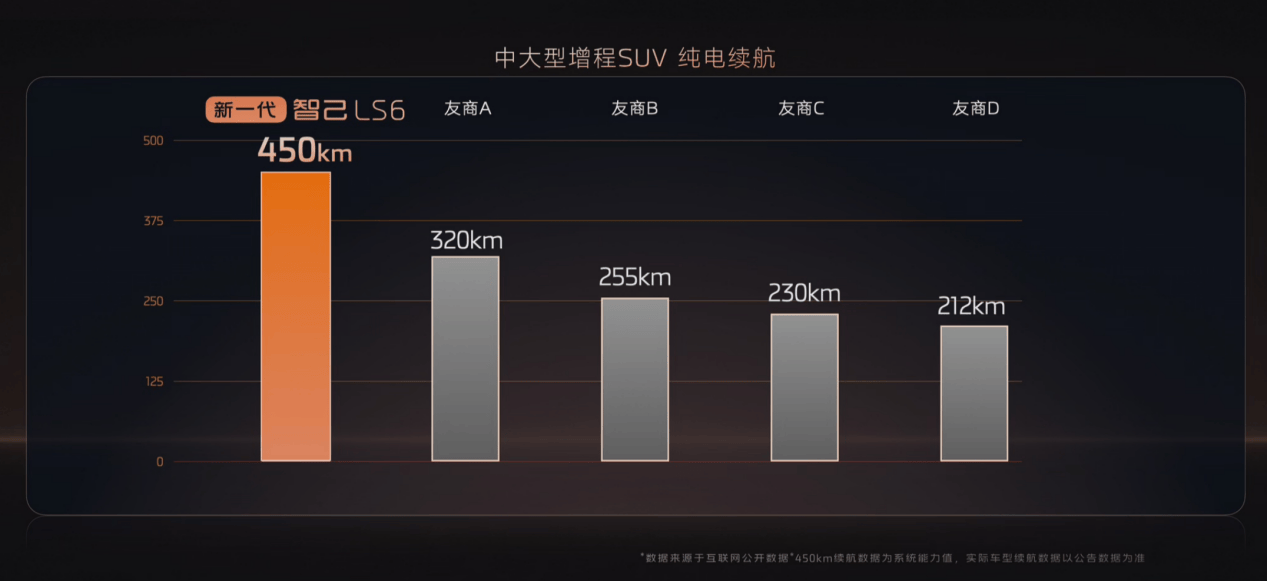 這表明,智己LS6增程版的純電續航已遠高于在售增程車的純電續航,甚至已經和一些純電車的都差不多了。這還意味著,智己LS6增程版幾乎可以真的被當作純電車來開,解決了用戶關于增程車純電續航短的痛點,對于不方便裝充電樁的用戶尤為有用。