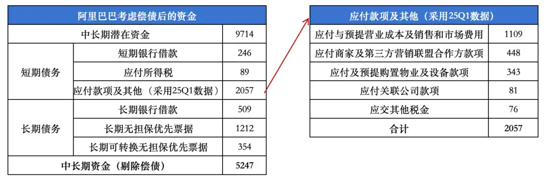 第三個層次對應資金約5247億元:截至2025上半年,阿里巴巴短期負債(應付款項及其他、短期借款、短期債券、應付稅費)共2392億元,長期負債(長期借款、長期債券、長期票據)共2075億元,合計4467億元。因此在考慮到負債的償還后,阿里巴巴能夠動用的最大資金量約為5247億元。