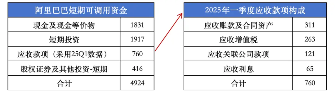 第一個層次對應資金約4924億元:截至2025上半年,阿里巴巴賬面現金1831億元、短期投資1917億、短期股權證券及其他投資416億元、各類應收款項約760億(采用25Q1數據替代),公司短期可調動資金4924億元。