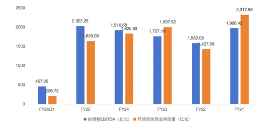 拉長周期看,阿里巴巴FY21-FY25(即2021財年到2025財年)的經調整EBITDA、經營活動凈現金流總額基本接近,均為9200多億元。但由于經調整EBITDA排除了應收賬款、應付賬款、存貨短期變動對現金流的影響,因此對阿里巴巴而言,經調整EBITDA是一個更穩定的觀測指標。